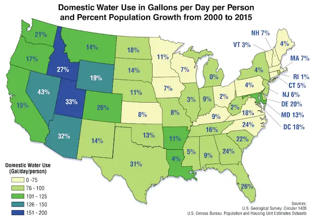 The picture below is sourced from the EPA.gov website and displays a breakdown of water use in gallons per day per person across the country.